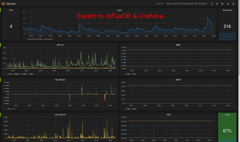 - 将所有系统统计信息导出到CSV,InfluxDB,Cassandra,OpenTSDB,StatsD,ElasticSearch甚至RabbitMQ。Glances还提供了专用的Grafana仪表板。