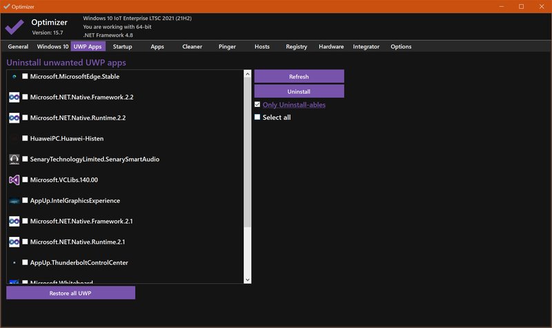 卸载UWP应用: 对于用户不需要的UWP(Universal Windows Platform)应用程序,Optimizer 提供了一键卸载的功能,确保系统不被这些应用程序拖慢速度。