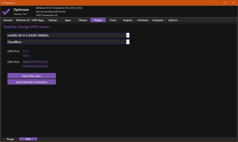 DNS服务器快速更改: Optimizer 提供了一键更改DNS服务器的功能,用户可以从一个预制的DNS服务器列表中选择,确保网络连接更为快速和稳定。