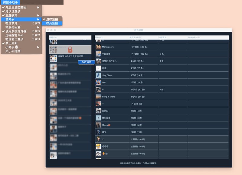 Session列表某行出现拒收消息,可以在Mac上完全拒收此群消息,避免打扰。 - 右侧列表是依次是