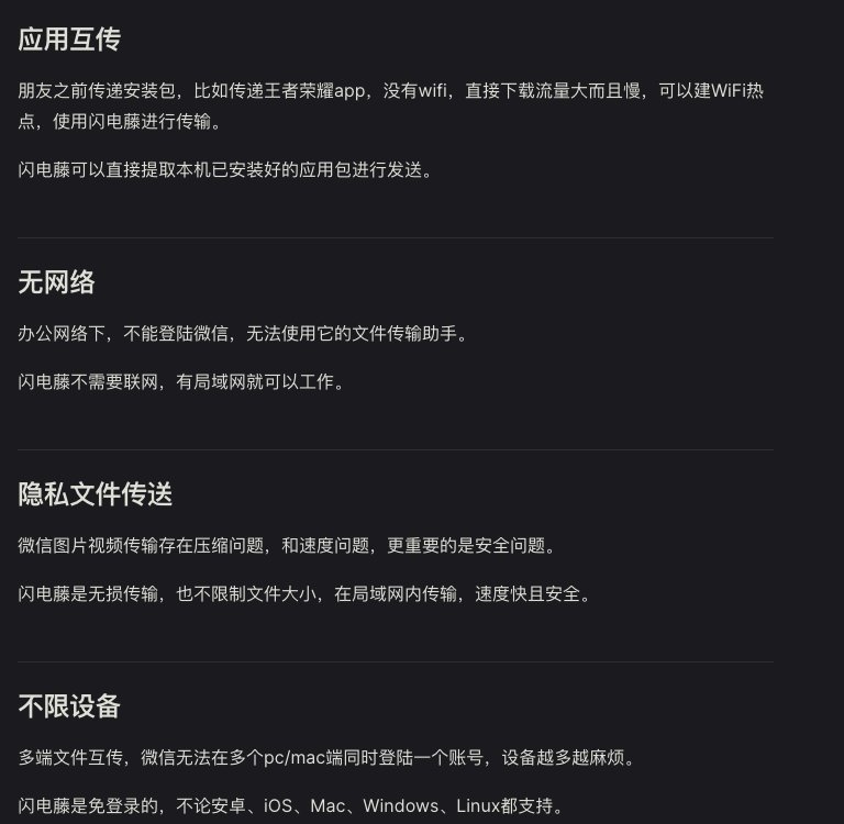 总之,闪电藤是一款基于局域网的文件传输工具,它可以让你在任何设备之间轻松传输文件,无需联网、无需注册、无需安装,只要在同一个局域网内,就可以实现高速、安全、稳定的文件传输。如果你有这样的需求,不妨试试闪电藤,相信你会喜欢的。