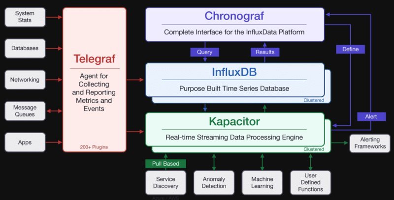 InfluxDB是一个时序数据库,用于存储和查询高精度的时序数据。Chronograf是一个用户界面,用于可视化和仪表盘化InfluxDB中的数据。Kapacitor是一个数据处理引擎,用于对时序数据进行转换、分析和告警。