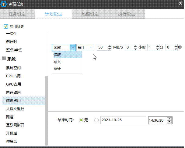 - 还支持系统条件触发,例如根据系统空闲时间、文件夹监控、CPU|GPU|内存|磁盘占用、网速、开机延迟、休眠恢复后延迟等条件触发。