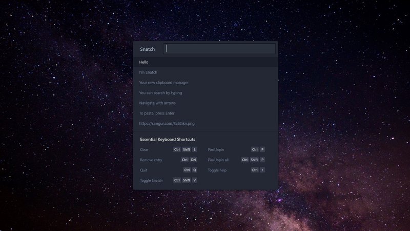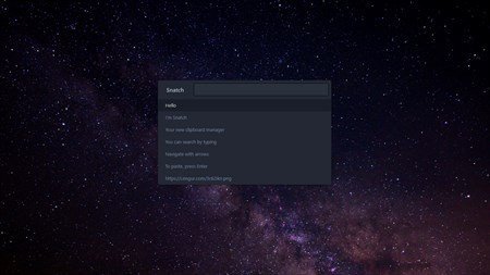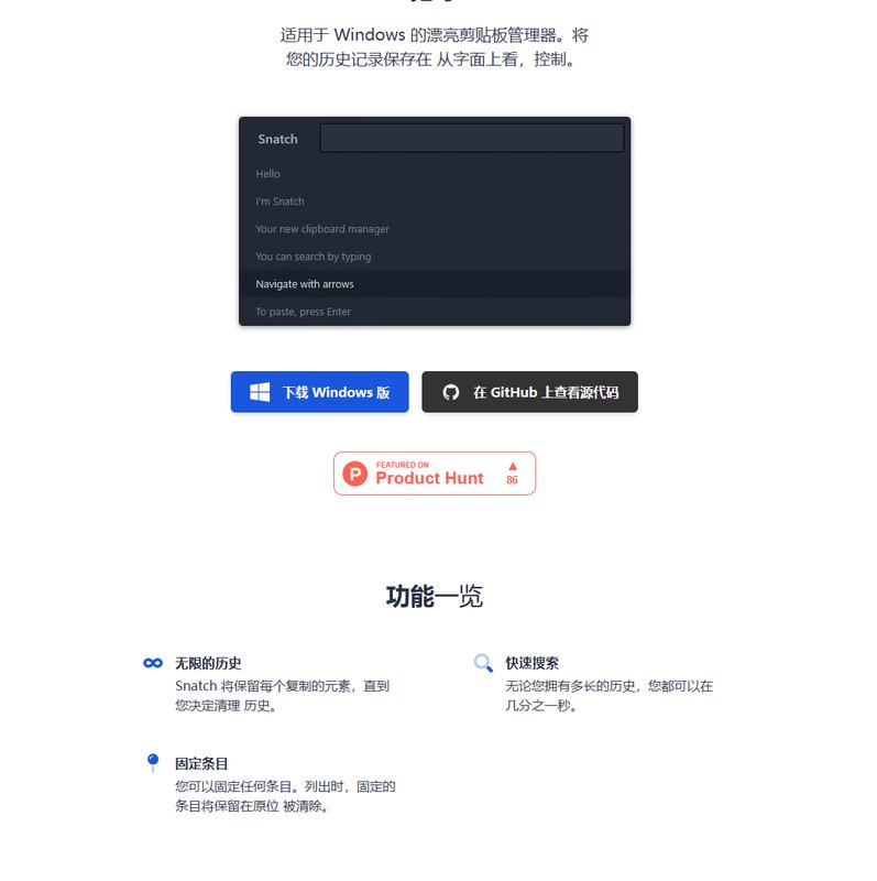 Snatch 有多种功能特点,例如无限历史记录、快速搜索、固定条目、模糊搜索、图片支持和主题。