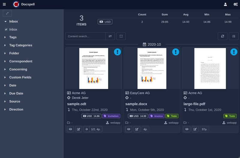 Docspell还可以将不同来源的文件统一起来,例如扫描仪、电子邮件和其他文件。它可以读取多种文件类型,如ZIP和EML(电子邮件文件格式),并提取其中的内容。它还可以将所有文件转换为PDF,并保留原始文件。如果文件是图像数据(通常是扫描仪返回的),则生成的PDF包含提取的文本,并且可以搜索。