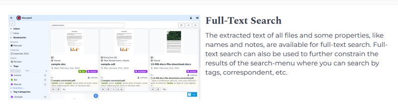 Docspell还提供了全文搜索的功能,你可以通过文本和一些属性,如名称和备注,来搜索你的文档。全文搜索也可以用来进一步约束搜索菜单的结果,你可以通过标签、通讯人等来搜索。