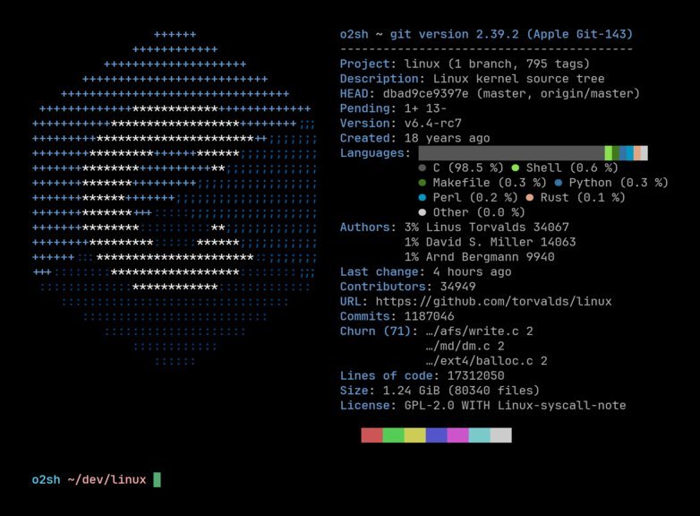 onefetch 的灵感来自于 neofetch,一个用于显示系统信息的命令行工具。