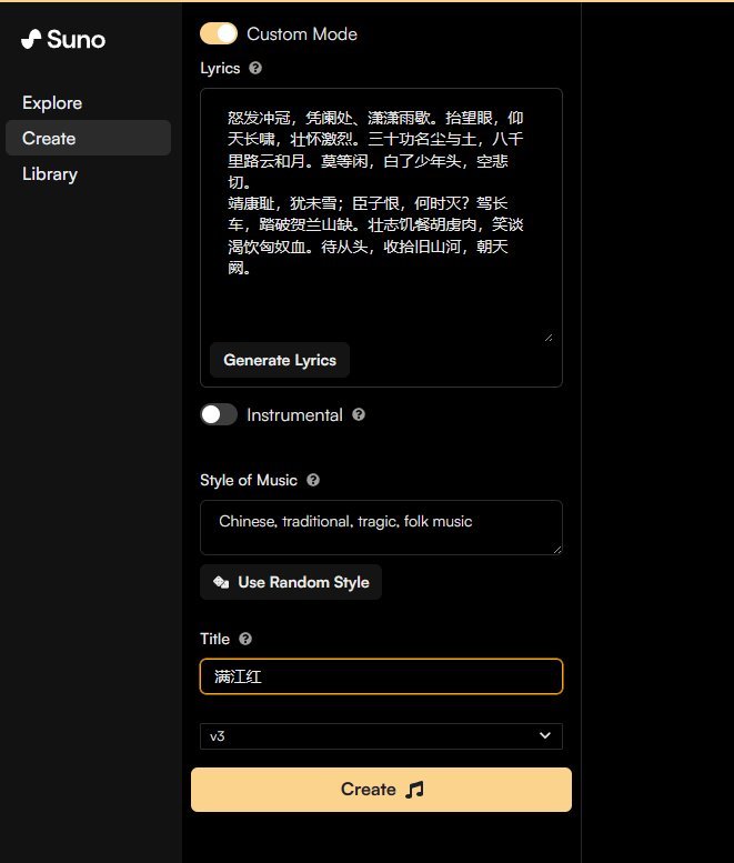 自定义模式:用户可以在「Custom Mode」中给输入的歌词填曲。只需在「Lyrics」处填入歌词,在「Style of Music」处写入歌曲的风格提示词,Suno AI就能够依照指定风格生成出一段歌曲。
