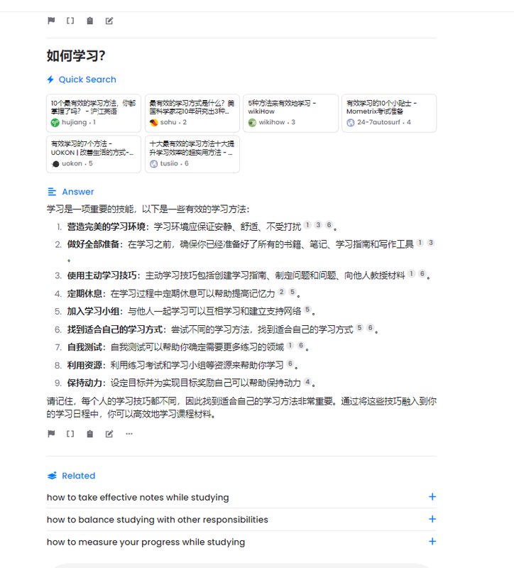 如下是一个常规的使用,未使用gpt-4.可以看到除了给到一些常规的网上返回的链接外,还有一部分是AI的回答,而这些回答部分后面有标注,是根据上述的quick search内容的总结或提取。