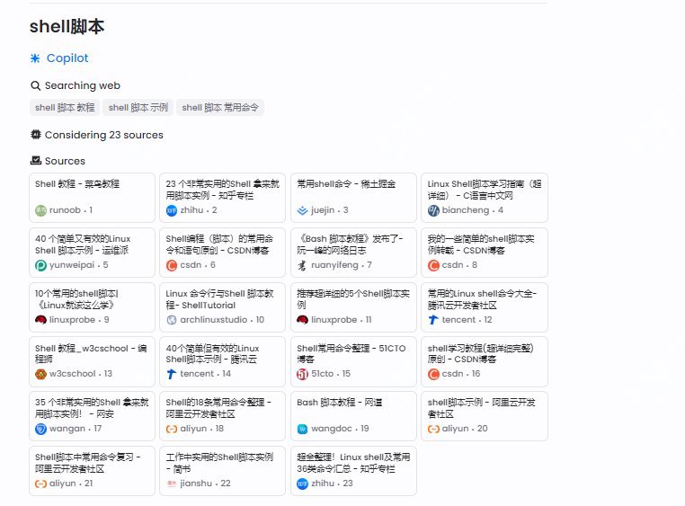 如下同样是一个gpt-4模型的提问,是关于shell脚本的一个提问,可以看到基本汇总了你可能用到的一些内容,而且真正的做到了没有广告。