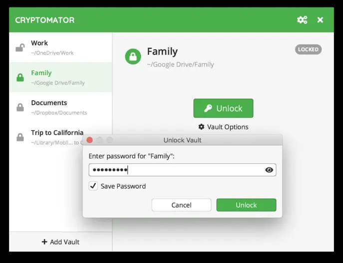 - 挂载虚拟驱动器:创建保险库后,点击“解锁”按钮,输入密码,Cryptomator 会将保险库挂载为一个虚拟驱动器。