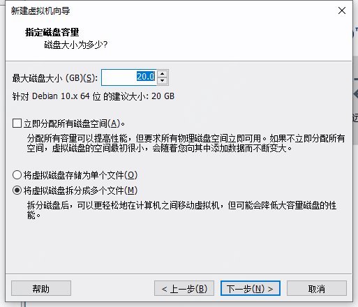 - 可以根据需要配置需要的磁盘大小,默认20G,建议选择40G,不然安装软件会失败